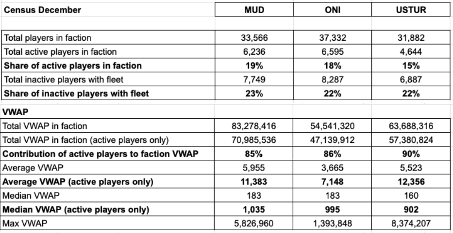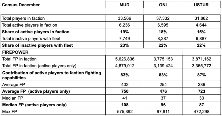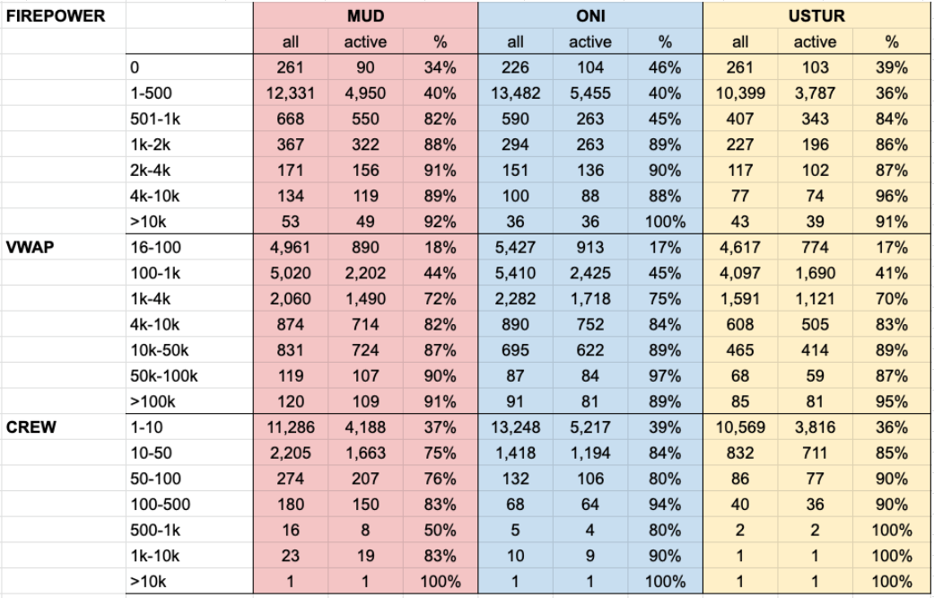 • Loss of active players: -7% (Mud), -5% (Oni), -6% (Ustur) • Every faction has 22-23% of inactive players who still have a fleet
