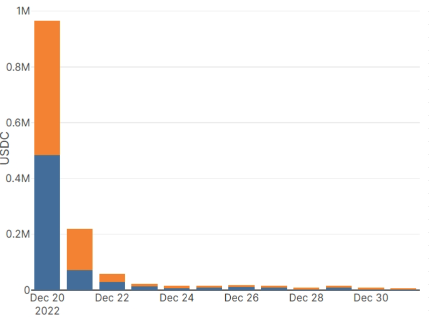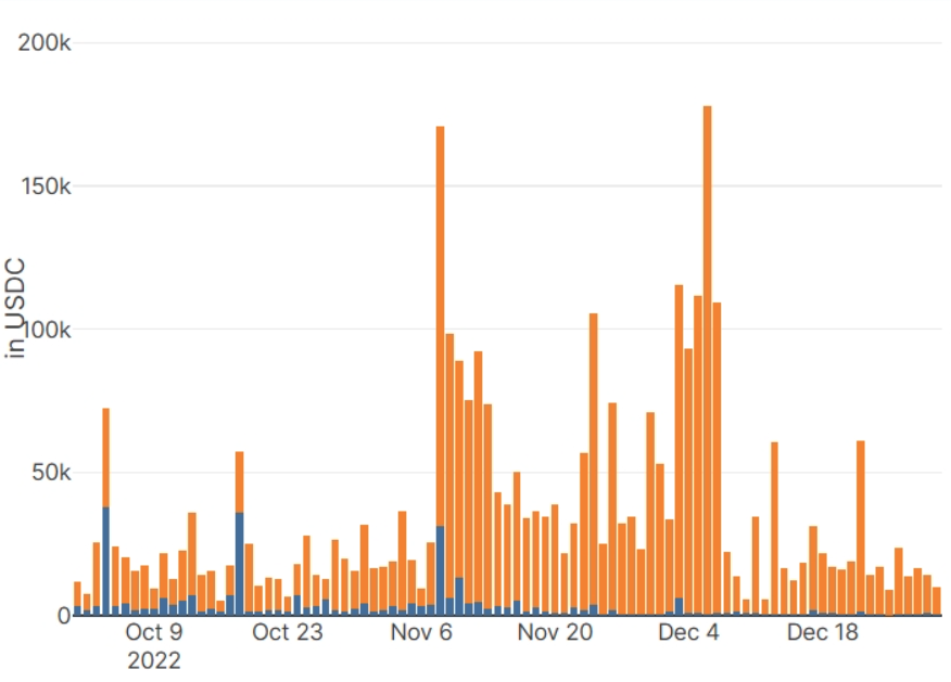 • We saw high trading volume in the first days of December when ship discounts were still at 80% • After that, the daily trading volume in ships leveled off at an average of $20k • The trading volume in USDC is almost 100% of the total volume
