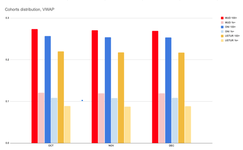 • No major changes in total and Average VWAP MoM • Median VWAP MOM for active players: +4% (Mud), +6% (Oni), +13% (Ustur) • Converging median with average of VWAP indigates a smaller gap between high tear (whales) and low tear players