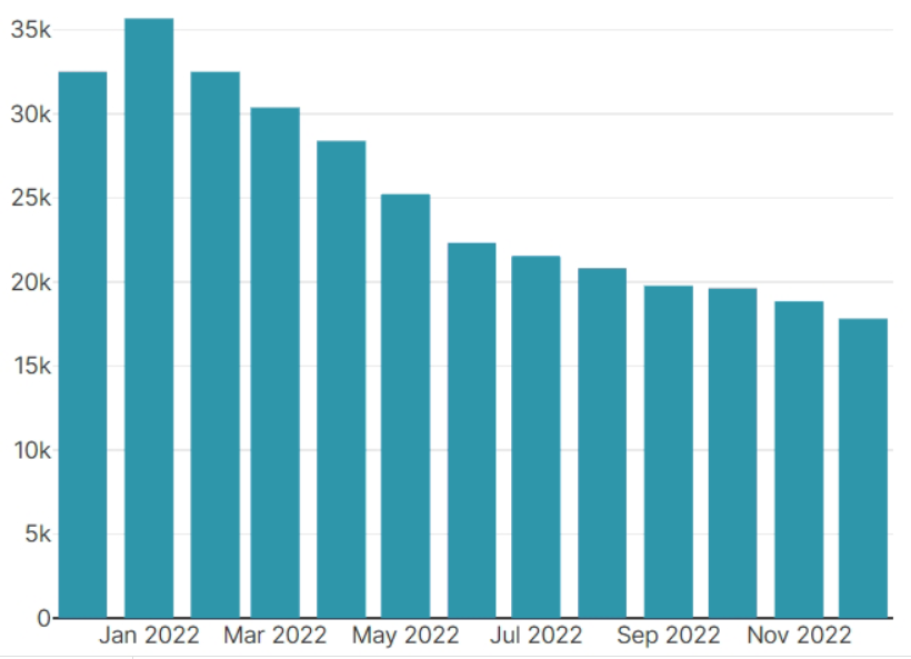 • At the end of December 2022 we had 17,800 monthly active users. About 1,000 fewer than the previous month • In fact, we lost about 3,000 and gained about 2,000 active users • Weekly active users have dropped to 13k and daily to 8k