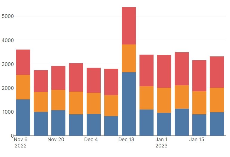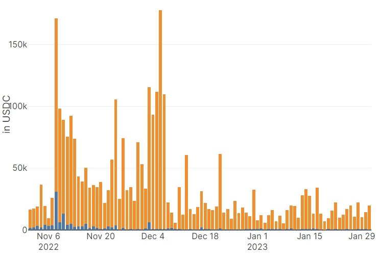 After the FTX collapse and ship discounts in late Nov/Dec, buy-sell trading volume is back to normal (see Notes for explanation)